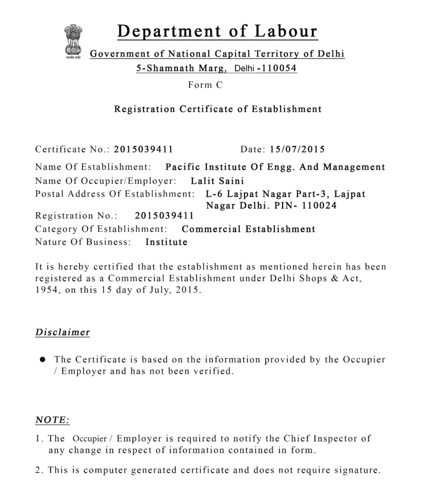 Department of Labour, Govt. of NCT of Delhi. Registration No. – 2015039411