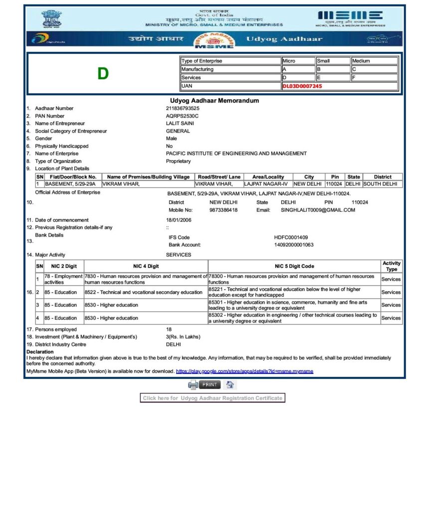 MSME (Ministry of Micro Small & Medium enterprises)(Govt. of India) Registration No. - DL03D007245